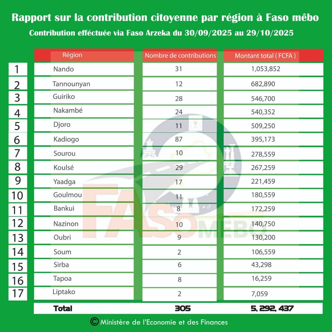 Point des contributions financières par région à Faso Mêbo, du 30…