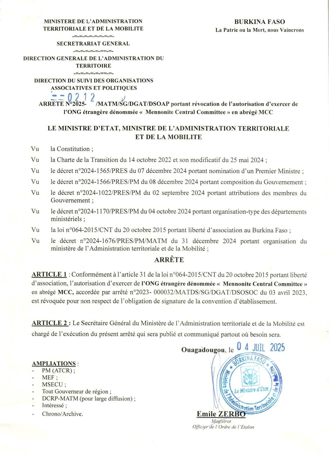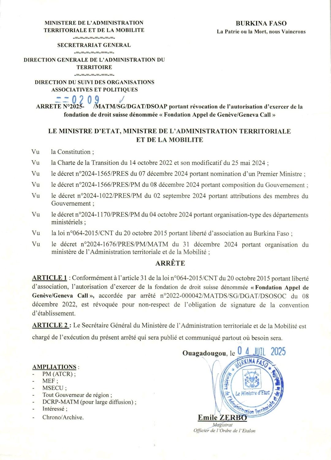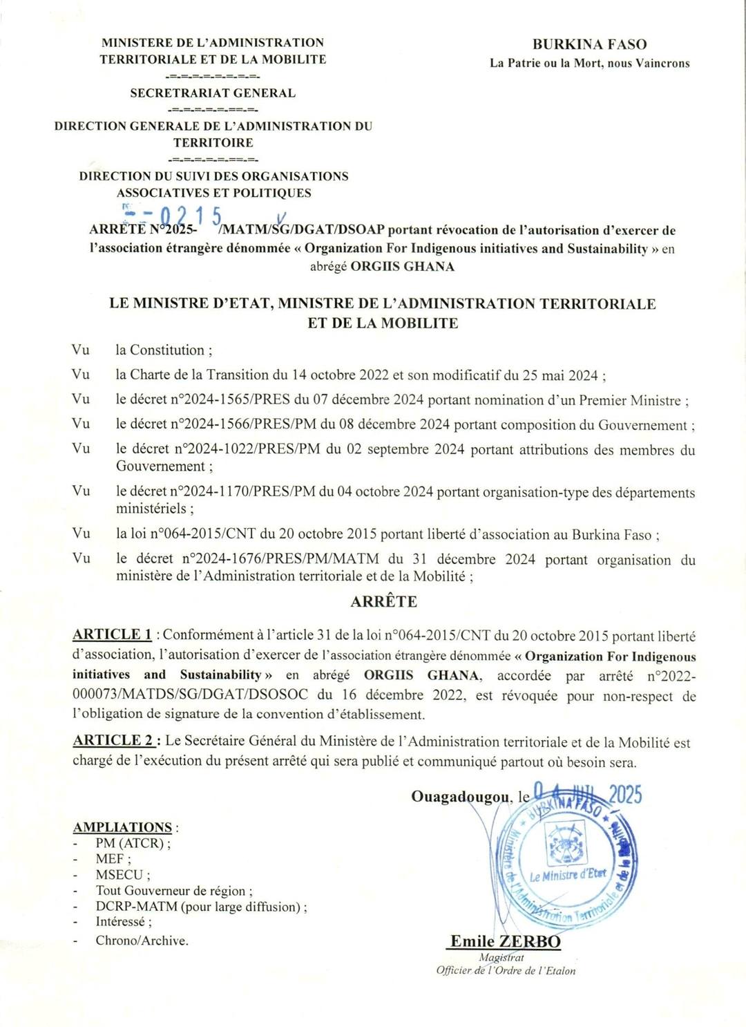 Arrêté portant révocation de l’autorisation d’exercer des ONG…